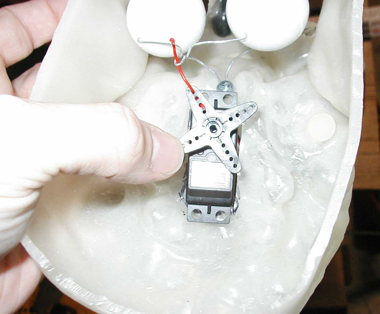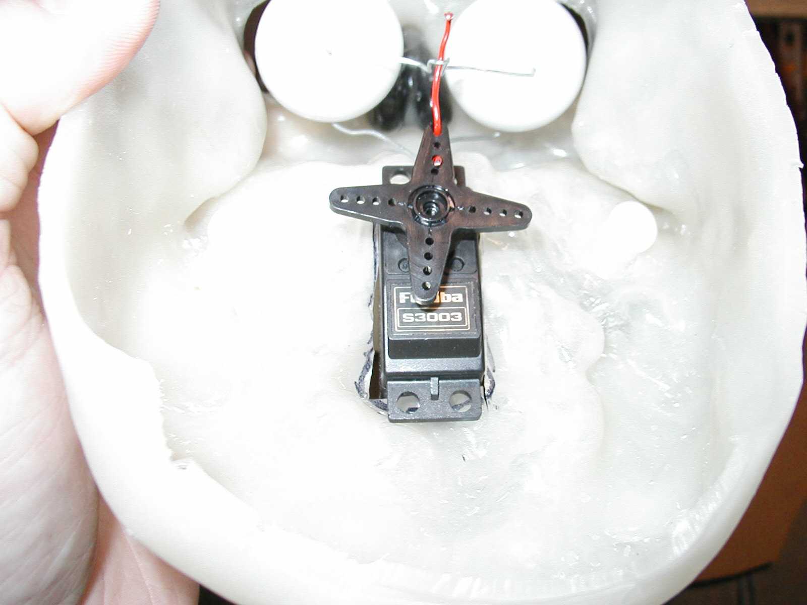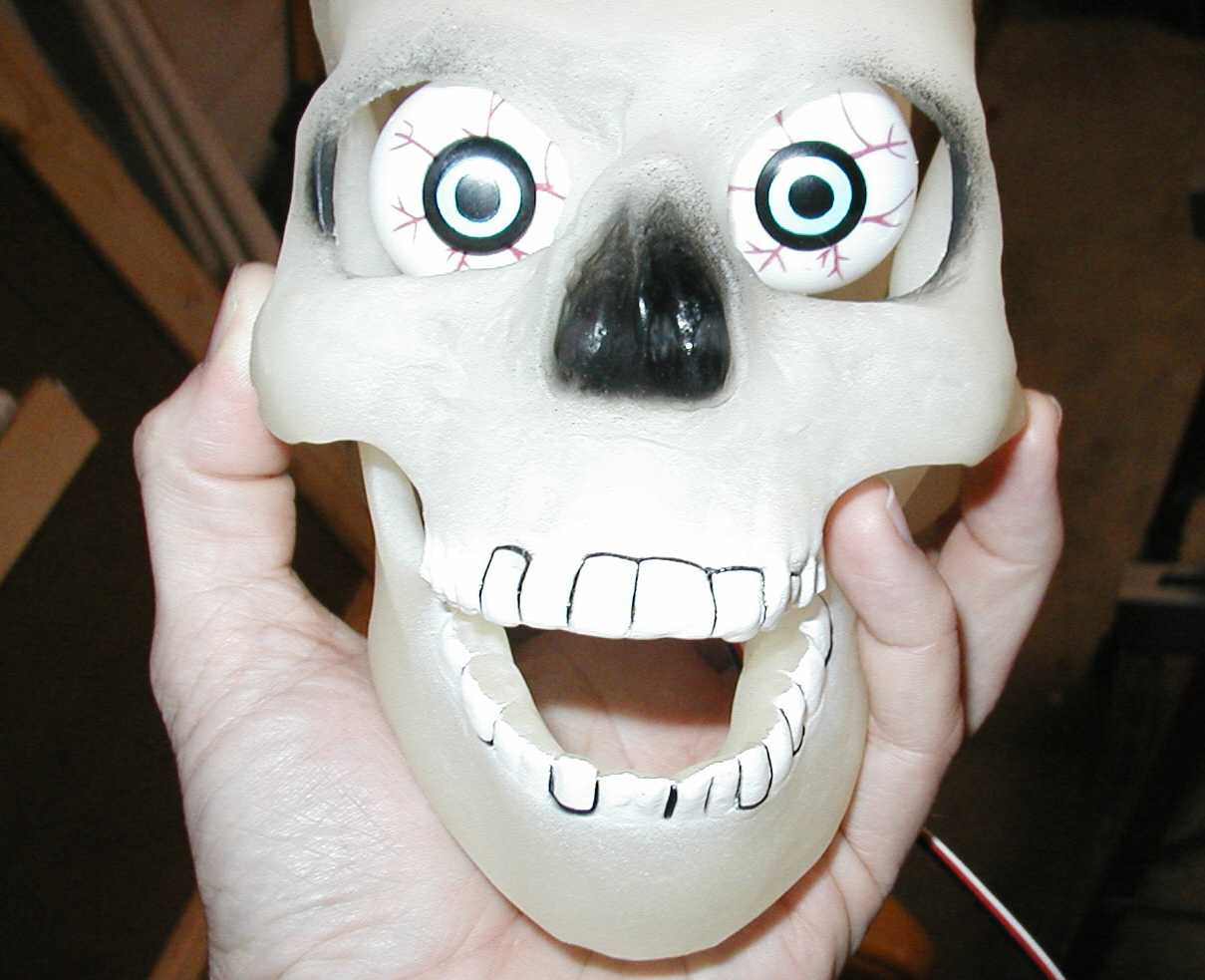 | This is the begining of my Animatronic skull. This will be mounted on the frame inside the dungeon door. I plan on getting a asudio/servo interface from cowlacious to drive the jaw. So far I have the eye motion done and I plan to make the neck pan left/right. I will be using a laptop computer running roboware. and using a mini ssc to convert serial to servo signals. I hope to be able to make some hands/with animated fingers using some other serveos I have. Depends on the amount of time I have. :) | |||