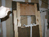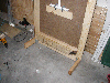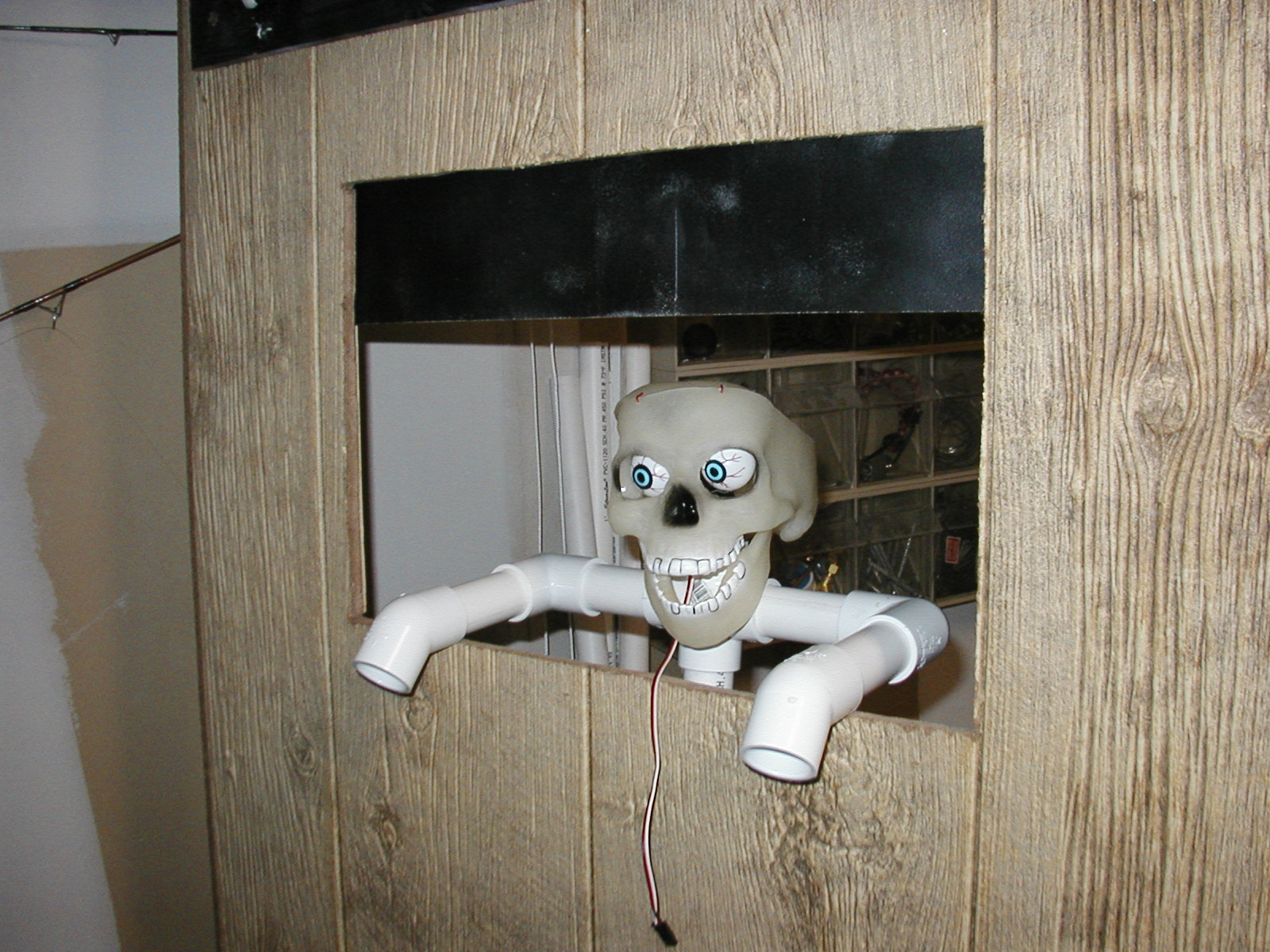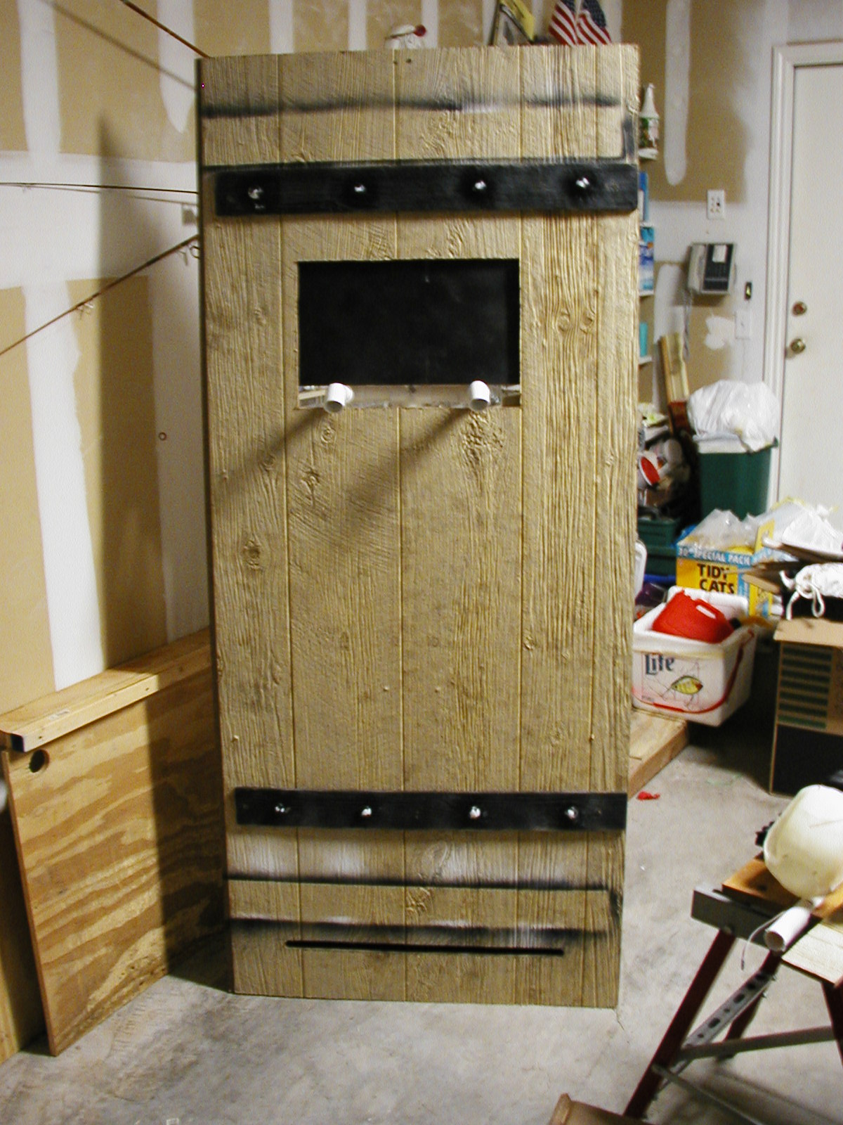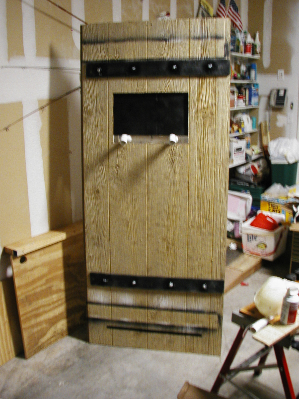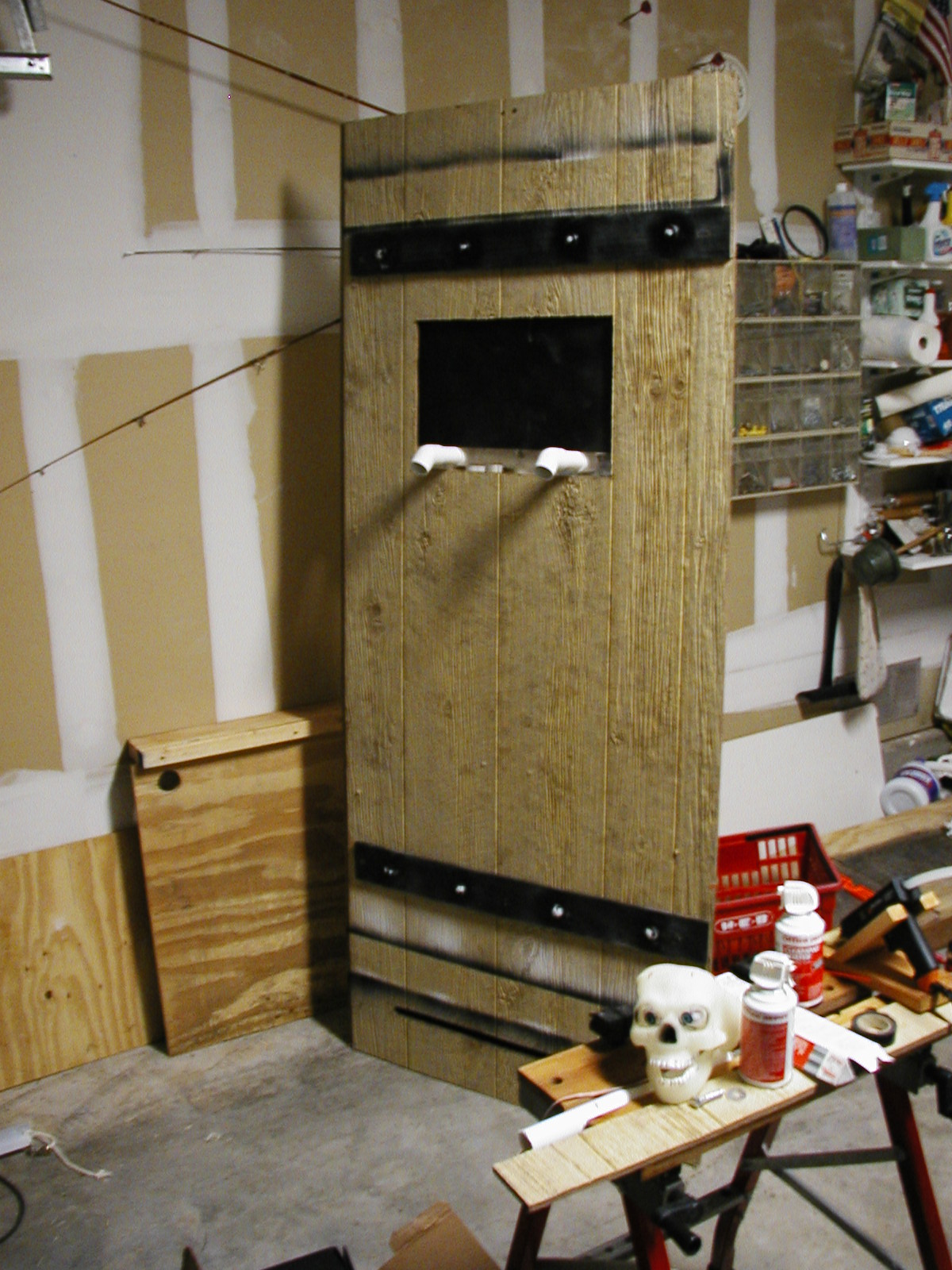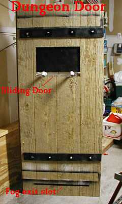 | This is the dungeon door that will replace the front door to our house. It will allow the fog machine, the fog chiller and the operators to all be hidden from view. The fog will exit from the bottom slot and the "speak easy" window will slam open to reveal the animatronic skull mounted on the torso frame. As designed, the prop should pop-forward after the window slams up. This also allows the door to drop onto the props fingers for some comedy if the operator chooses to do so. :) Though not mounted yet, the door will have a "knocker" placed right bebeath the speak easy window. This will be linked with a piezo sensor to my electronic drum kit that will trigger a very large very low pitched booming tom drum with a huge reverb on it. When the knocker is used it'll sound like a huge cavern is behind the door. As I get more built I'll try to update the page. | |||