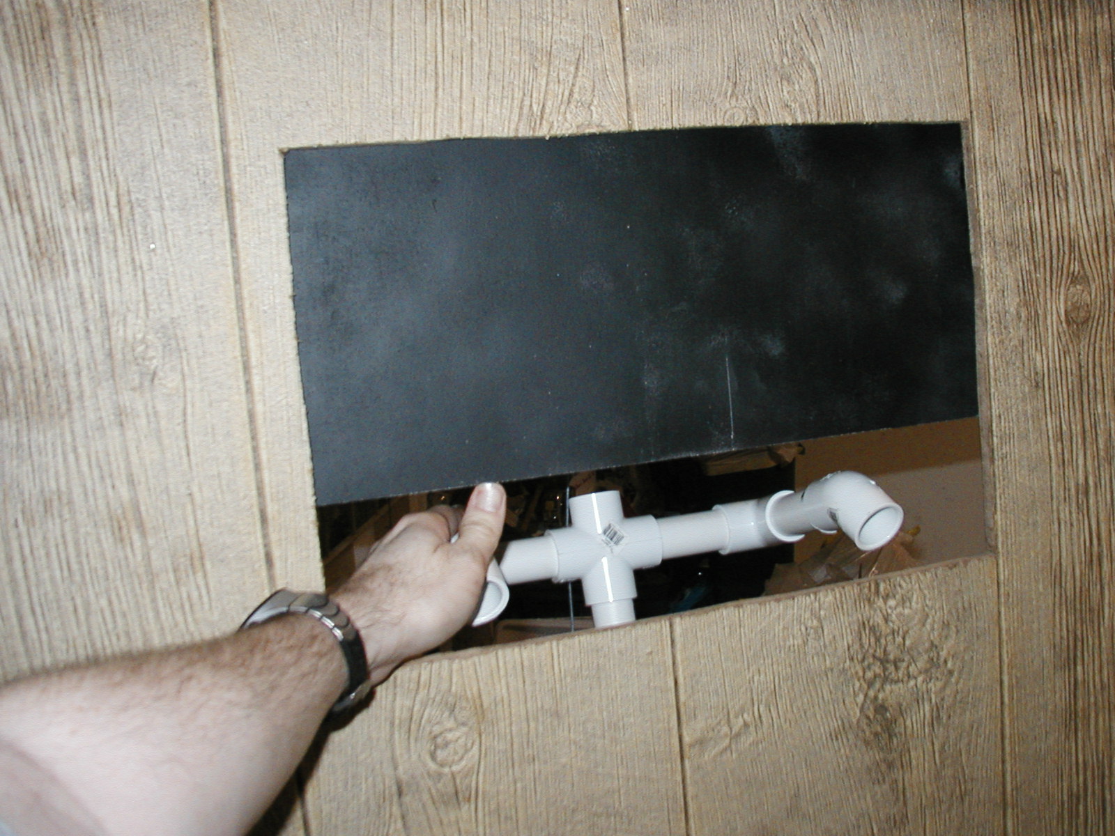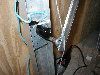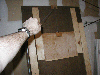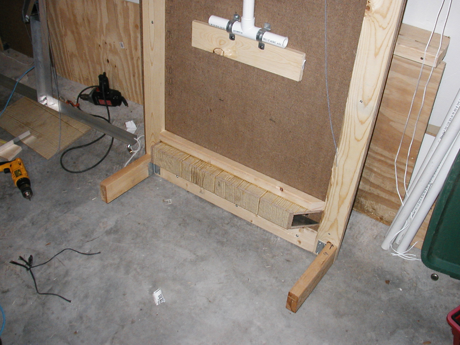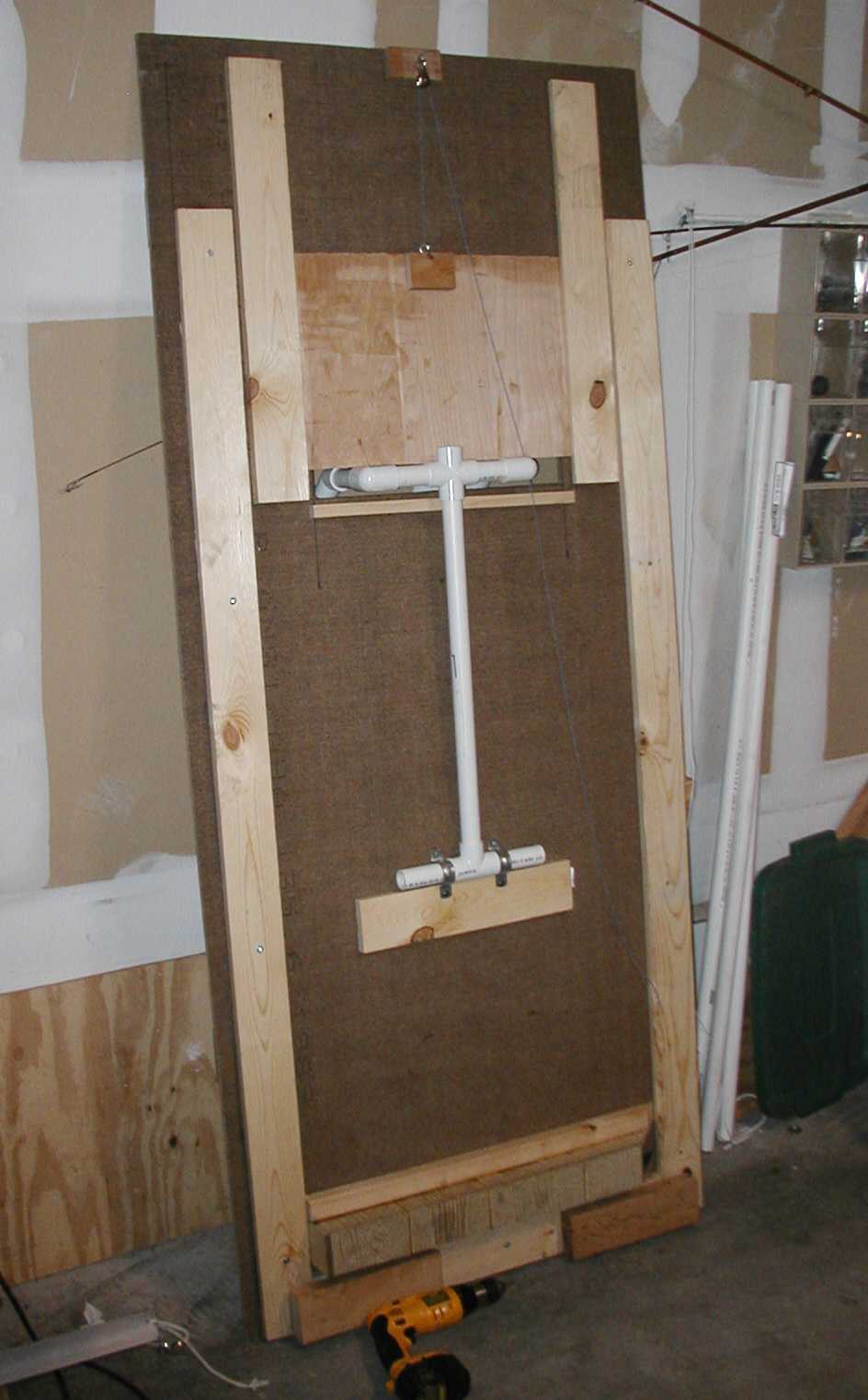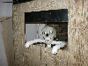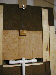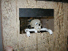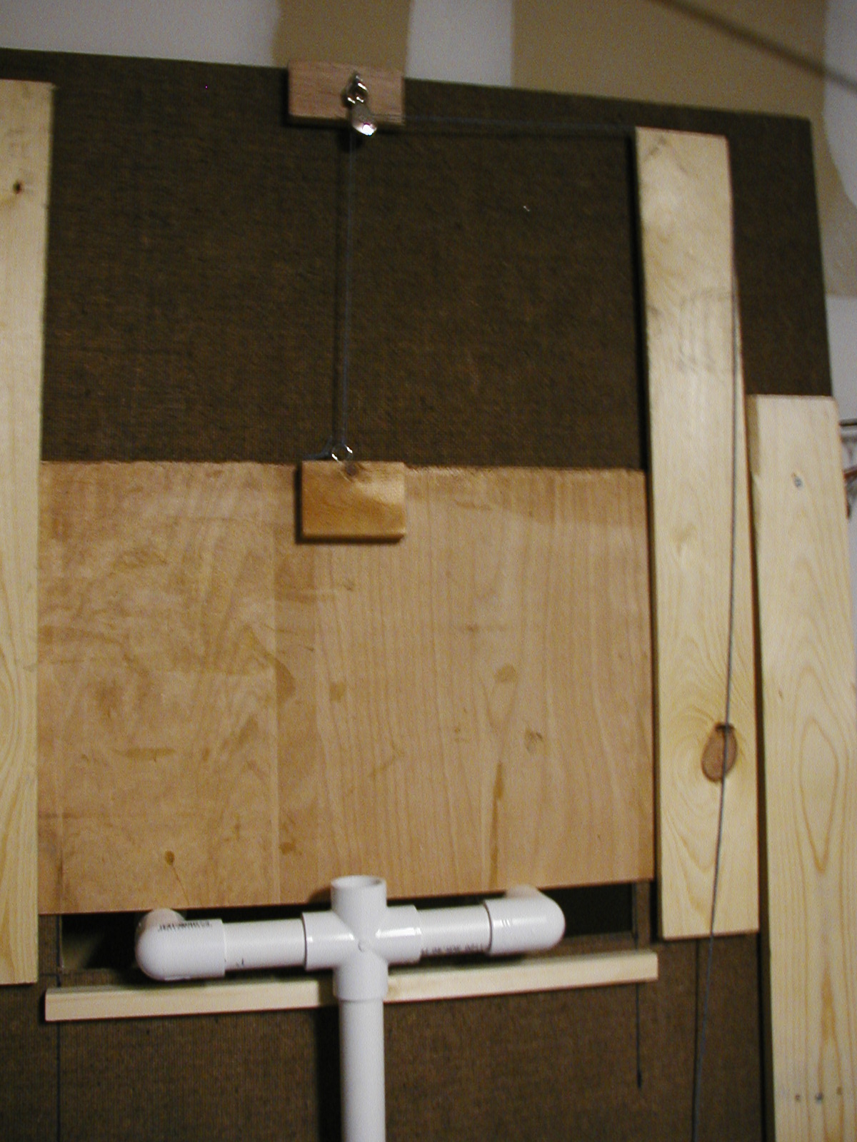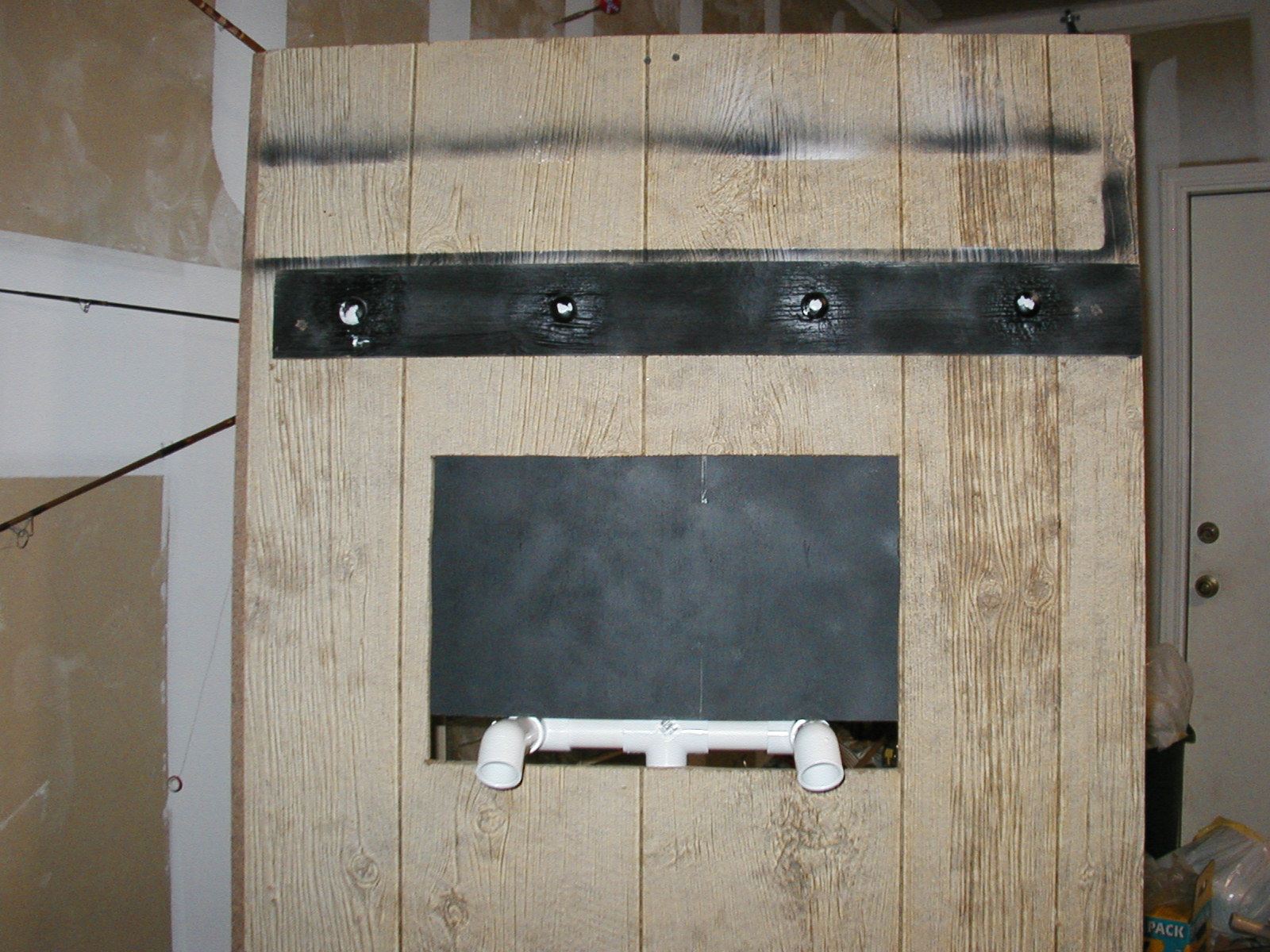 | This is the dungeon door that will replace the front door to our house. It will allow the fog machine, the fog chiller and the operators to all be hidden from view. The fog will exit from the bottom slot and the "speak easy" window will slam open to reveal the animatronic skull mounted on the torso frame. As designed, the prop should pop-forward after the window slams up. This also allows the door to drop onto the props fingers for some comedy if the operator chooses to do so. :) Though not mounted yet, the door will have a "knocker" placed right bebeath the speak easy window. This will be linked with a piezo sensor to my electronic drum kit that will trigger a very large very low pitched booming tom drum with a huge reverb on it. When the knocker is used it'll sound like a huge cavern is behind the door. As I get more built I'll try to update the page. | |||